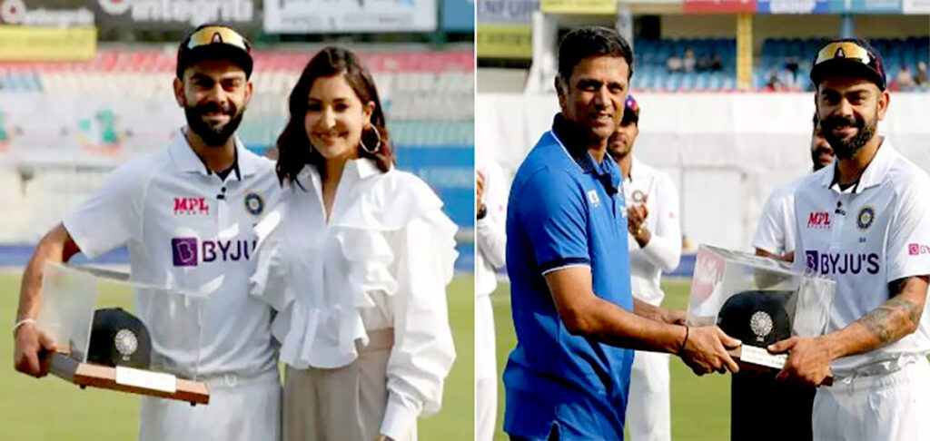 Before his 100th match against Sri Lanka in Mohali, the batsman was given a ceremonial cap by Rahul Dravid, who was captain of India in the past.