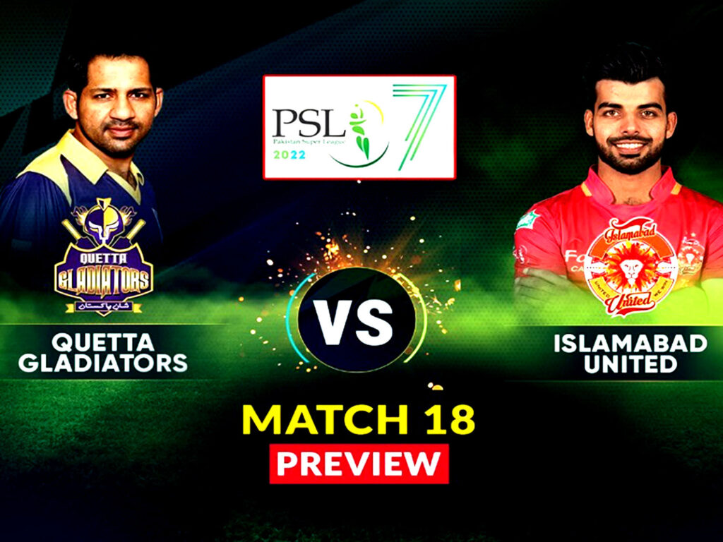 Quetta Gladiators and Islamabad United will clash at Gaddafi Stadium Lahore in the 18th match of the HBL Pakistan Super League (PSL) seventh season 2022.